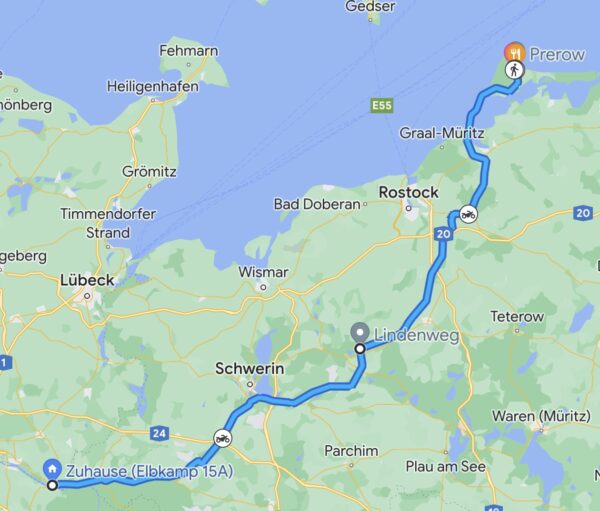 Da mein Bruder und seine Frau gerade eine Woche Urlaub in Prerow machten, hatte ich beschlossen, alleine auf den Darss zu fahren. Ich buchte eine Nacht in ihrer Ferienwohnung auf dem Sofa 🙂 . (Die Quartiere konnten wir kostenfrei stornieren). Nach einer gemütlichen Tour von 260 km quer durch M-V war ich gegen 15.30 Uhr dort. Nach kurzer Pause folgten ein Besuch der im Umbau befindlichen Seebrücke und ein Abendessen im Fischrestaurant Rennhack. Am nächsten Morgen ging es nach dem Frühstück wieder auf die Rückfahrt. Nach 250 km war ich bei bestem Wetter wieder um 15.00 Uhr zu Hause.