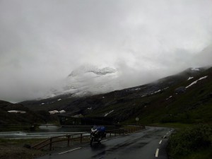 Gestern war ein sehr gemischter Tag. Hatte mich am Morgen (04.45Uhr-war ja ausgeruht vom Vortag), weil es nicht regnete, entschlossen, zumindest noch den Atlanterhavvegen anzufahren und Kristiansund noch mitzunehmen und dann mal zu schauen. Also duschen, Frühstück, packen. Dauert immer so um die drei Stunden. Habe alles trocken hingekriegt und um 0800 saß ich im Sattel. Hatte die Regenklamotten gleich angezogen. Der ließ dann auch nicht lange auf sich warten, hörte aber nach einer halben Stunde wieder auf. War dann noch auf dem Trollstiegen und bin anschließend den Atlanterhavveg mit Atlanterhavtunnel gefahren. Danach Richtung Trondheim und das Wetter wurde immer schlechter – vor allem kälter. Hatte kurz vorm Trollstiegen schon im leichten Schneetreiben gestanden. Da habe ich die Entscheidung getroffenen, zurück zu fahren. Das passte ganz gut, denn genau dort kreuzte die Rückfahrt meiner ursprünglichen Route die Weiterfahrt nach Norden. Weil es so kalt war und zwischendurch immer mal wieder regnete, hatte ich mir vorgenommen nicht wild zu campen, sondern mir sogar eine Hütte zu mieten. Was war, es kam und kam kein Campingplatz. Nach 100 km und 2 Stunden Ausschau habe im um 18.15 Uhr ziemlich gefrustet mein Zelt auf einem Rastplatz neben der Straße aufgebaut. Unterwegs hatte ich dann auch noch ein knapp 20 km langes Schotterstraßenstück. Meine Maschine sieht aus wie frisch zementiert.